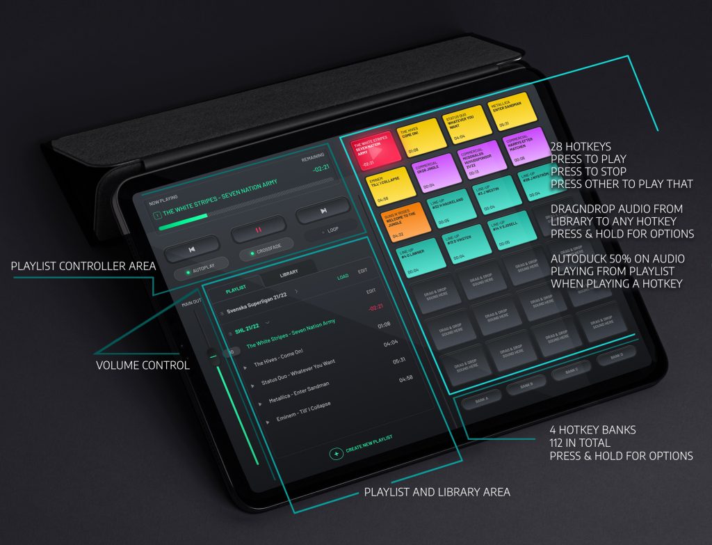 Fill your device with the sounds and songs you need. Download the app and fire it up. Start by playing around. Now you are on the way to BIG UP your event. More Options and functions are always in development..