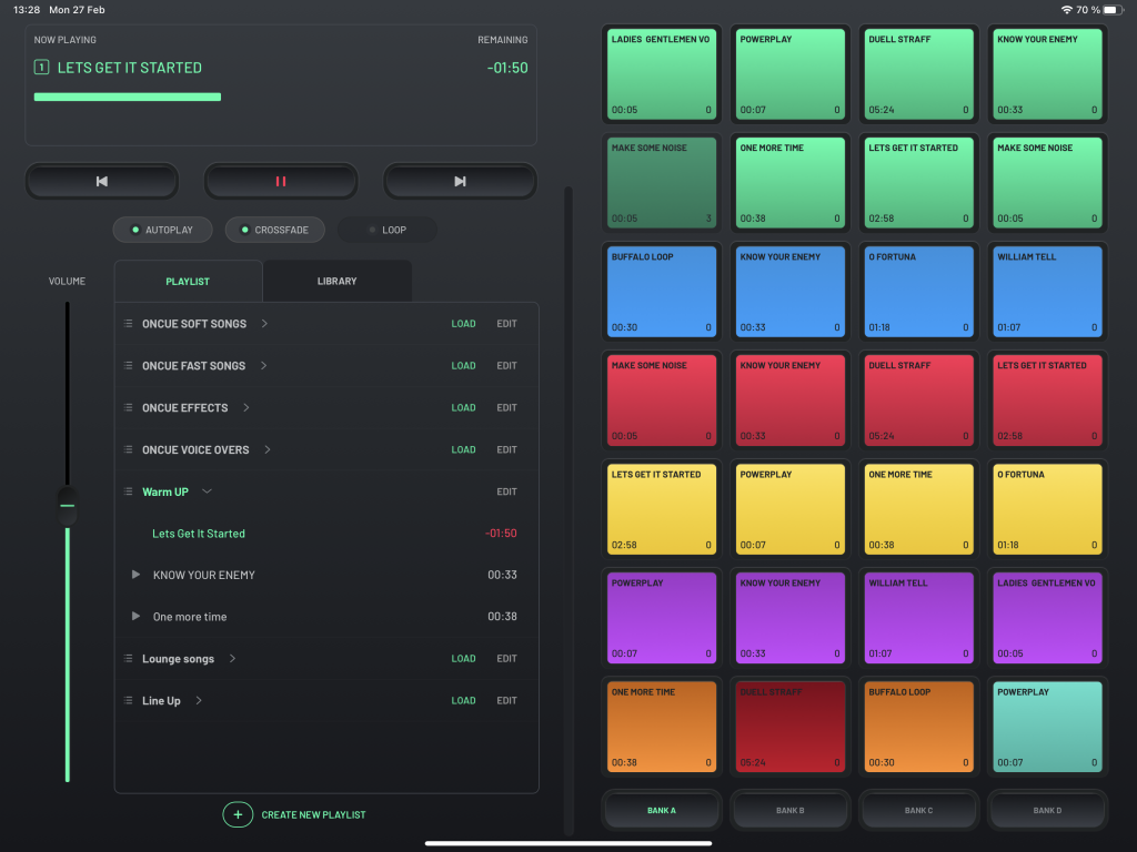 Select sounds from your library and add to playlists. Load playlist to top left player.